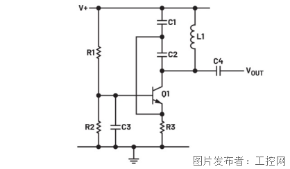 图1为典型的Colpitts振荡器。决定频率的并联谐振调谐电路由C1、C2和L1组成,用作共基极放大器Q1的集电极负载阻抗。这使得放大器仅在谐振频率下具有高增益。Colpitts振荡器的这种配置使用了共基极放大器。Q1的基极通过电阻分压器R1和R2偏置到适当的直流电平,但通过C3直接连到交流地。在共基极模式下,集电极处的输出电压波形与发射极处的输入信号同相。这确保了C1和C2之间节点的输出信号的一部分从调谐集电极负载反馈到发射极,从而提供所需的正反馈。请注意,此反馈仅为交流反馈,集电极与发射极之间不存在直流路径。