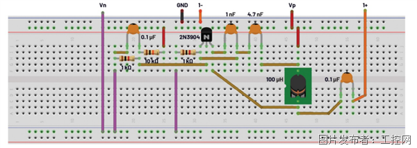 使用无焊试验板构建图2所示的Colpitts振荡器。从器件套件中选择偏置电阻R1和R2的标准值,使得发射极电阻R3设置为1 kΩ时,NPN晶体管Q1中的集电极电流约为1 mA。根据所选择的C1、C2和L1值,振荡器的频率可以在大约500 kHz到2 MHz的范围内变化。首先设置L1 = 100 μH、C1 = 4.7 nF且C2 = 1 nF。此振荡器电路可产生超过10 V p-p的正弦波输出,其频率近似于由所选L1值设定的频率。